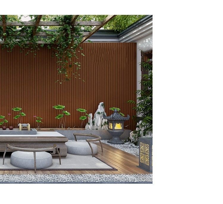 การตกแต่งผนังกลางแจ้ง: แผ่นผนังหุ้มไม้ภายนอก WPC เป็นวัสดุตกแต่งผนังกลางแจ้งที่เหมาะสำหรับที่อยู่อาศัยอาคารพาณิชย์สถานที่สาธารณะและการตกแต่งผนังกลางแจ้งอื่น ๆผนังไม้และการออกแบบตะแกรงทำให้อาคารดูเป็นธรรมชาติ ทันสมัย และเก๋ไก๋