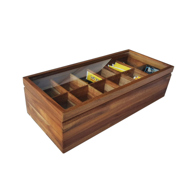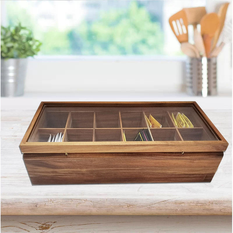 หน้าอกแบนปรับได้ 12 ช่องยื่นออแกไนเซอร์ไม้แข็งถุงชากล่องเก็บของพร้อมฝาแก้ว